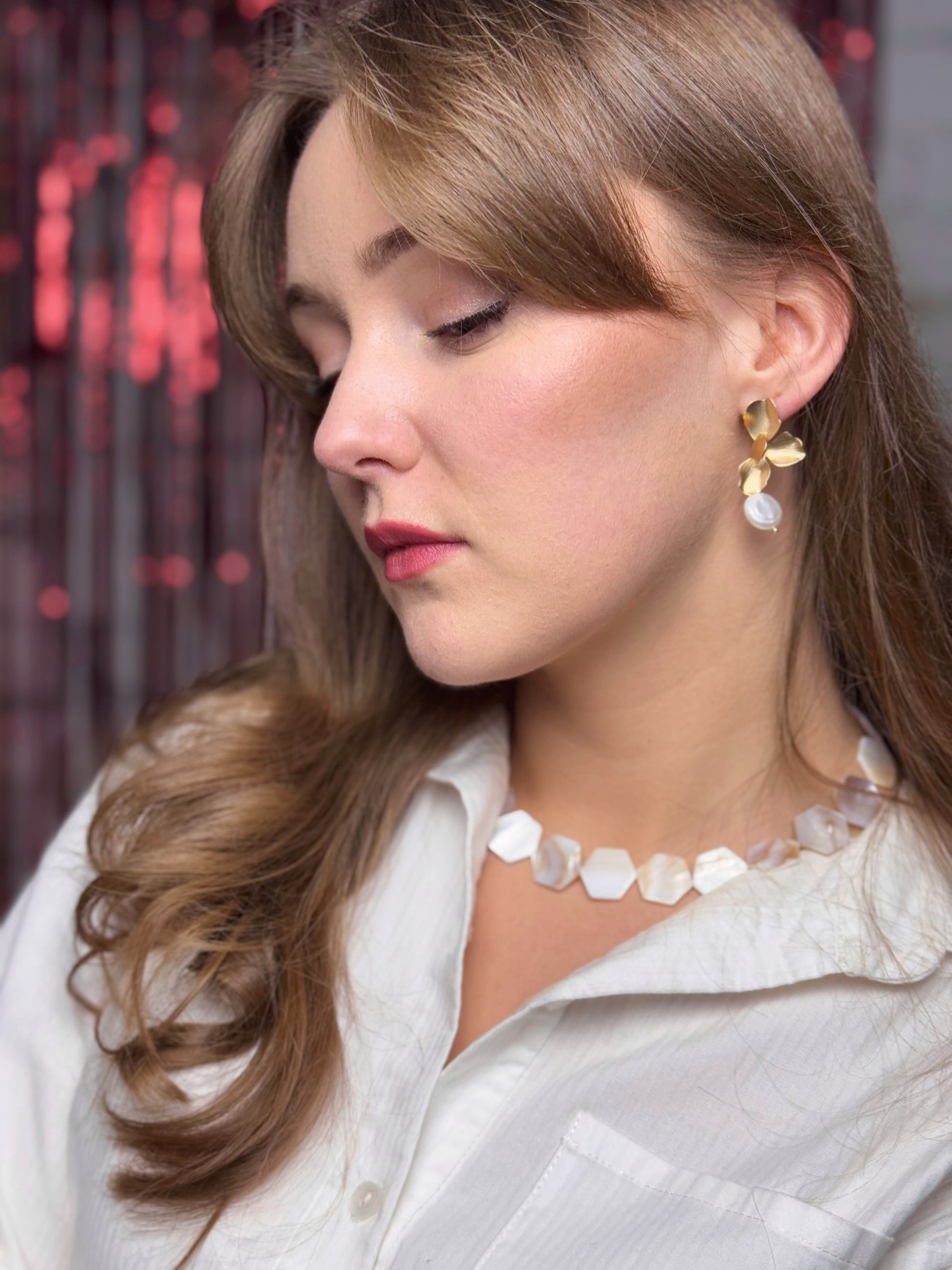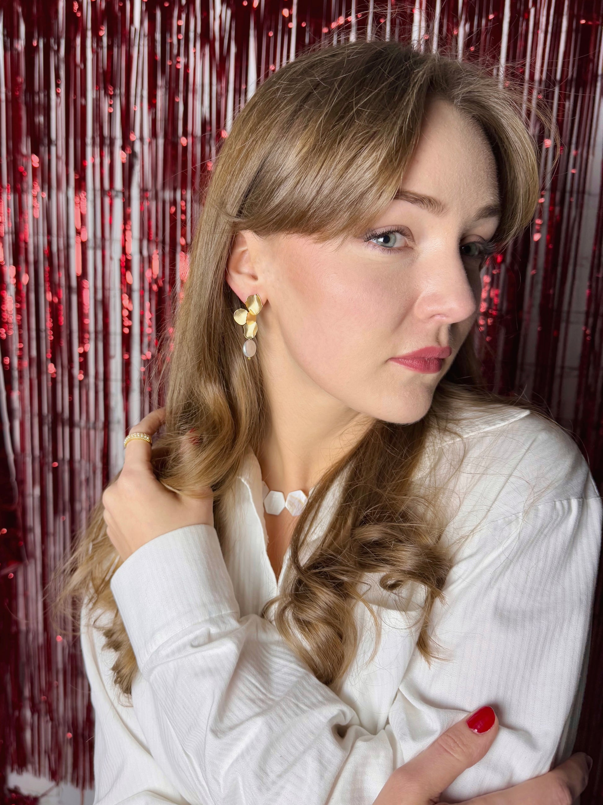 Izsmalcināti un sievišķīgi auskari, kas apvieno zieda maigo dizainu ar klasiskā baltā eleganci. Zelta krāsas zieda forma piešķir rotai dabas iedvesmotu šarmu, savukārt pērlīte rada harmonisku un mūžīgi aktuālu izskatu. Šie auskari ir lielisks papildinājums gan ikdienas, gan svētku tēlam!
