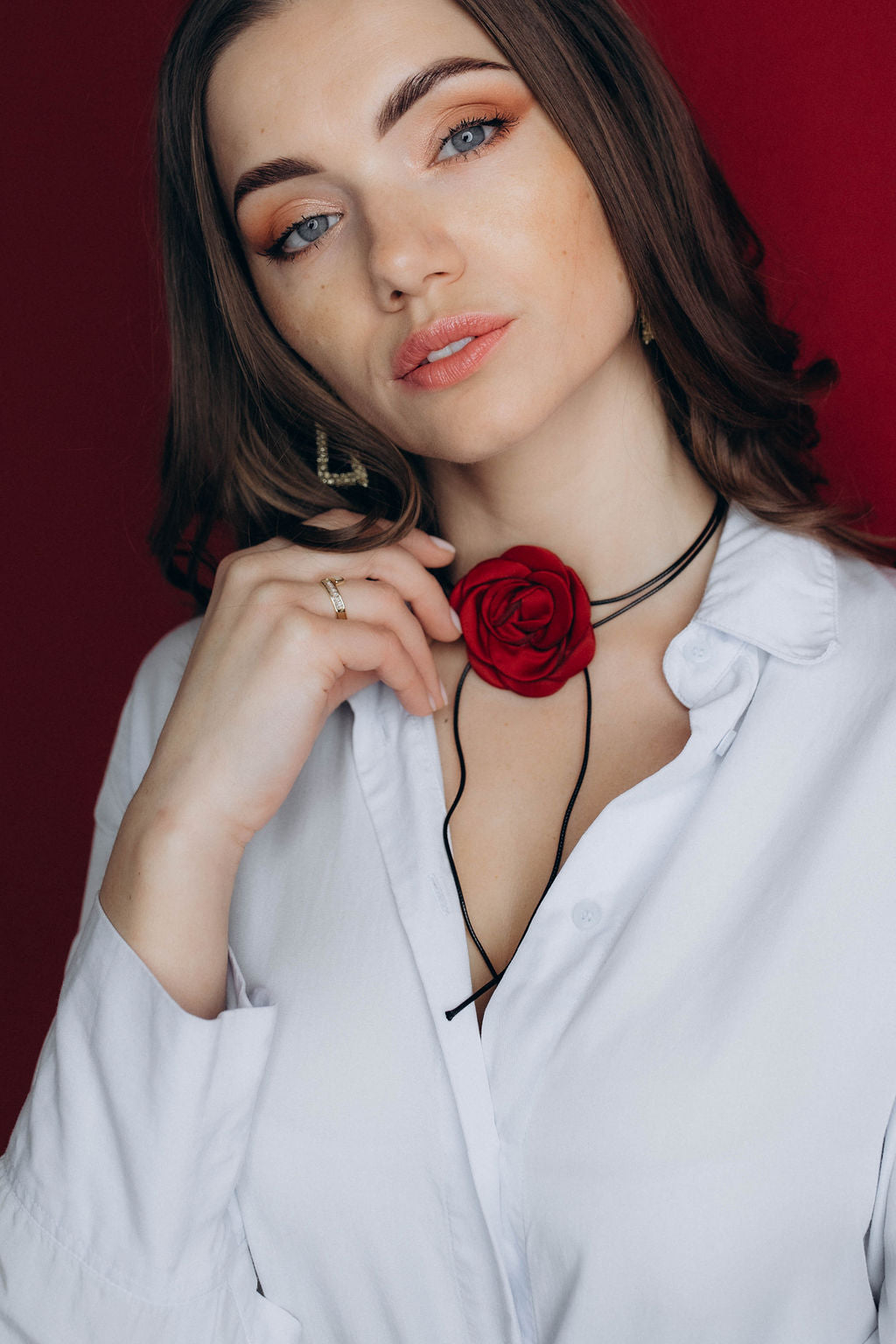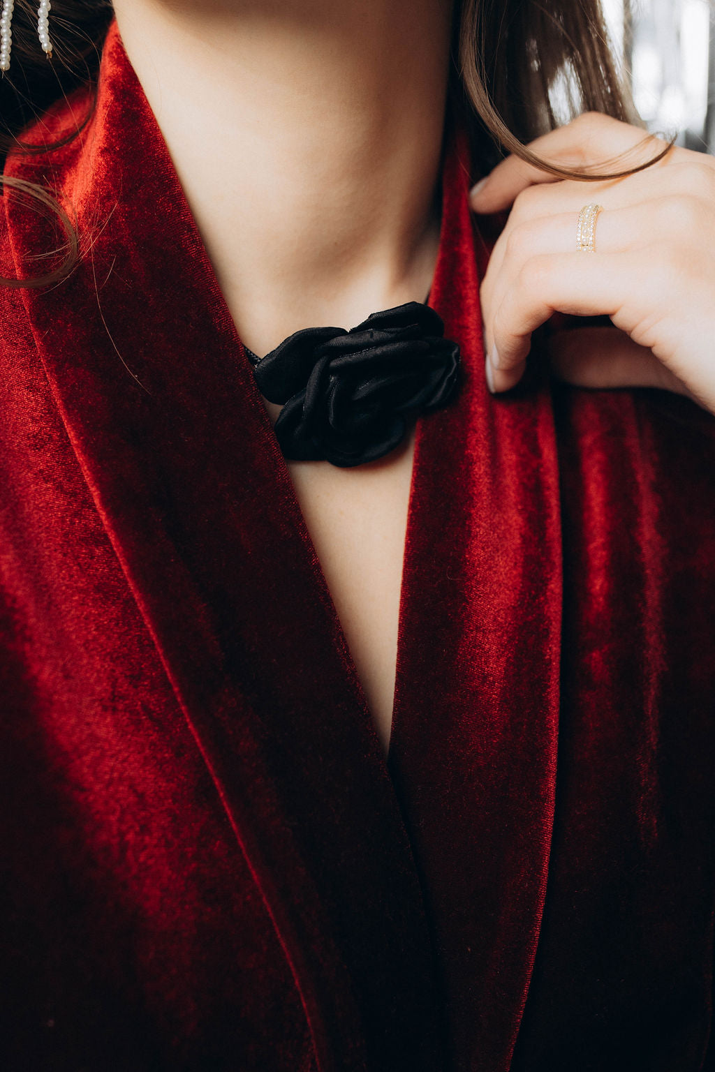 Šis skaistais puķu čokeris ir izgatavots no auduma un pieejams trīs dažādās krāsās. Tā maigs dizains ar ziedu elementiem piešķir tēlam romantisku un sievišķīgu akcentu, padarot to par ideālu rotu ikdienas tēlam vai svētkiem.