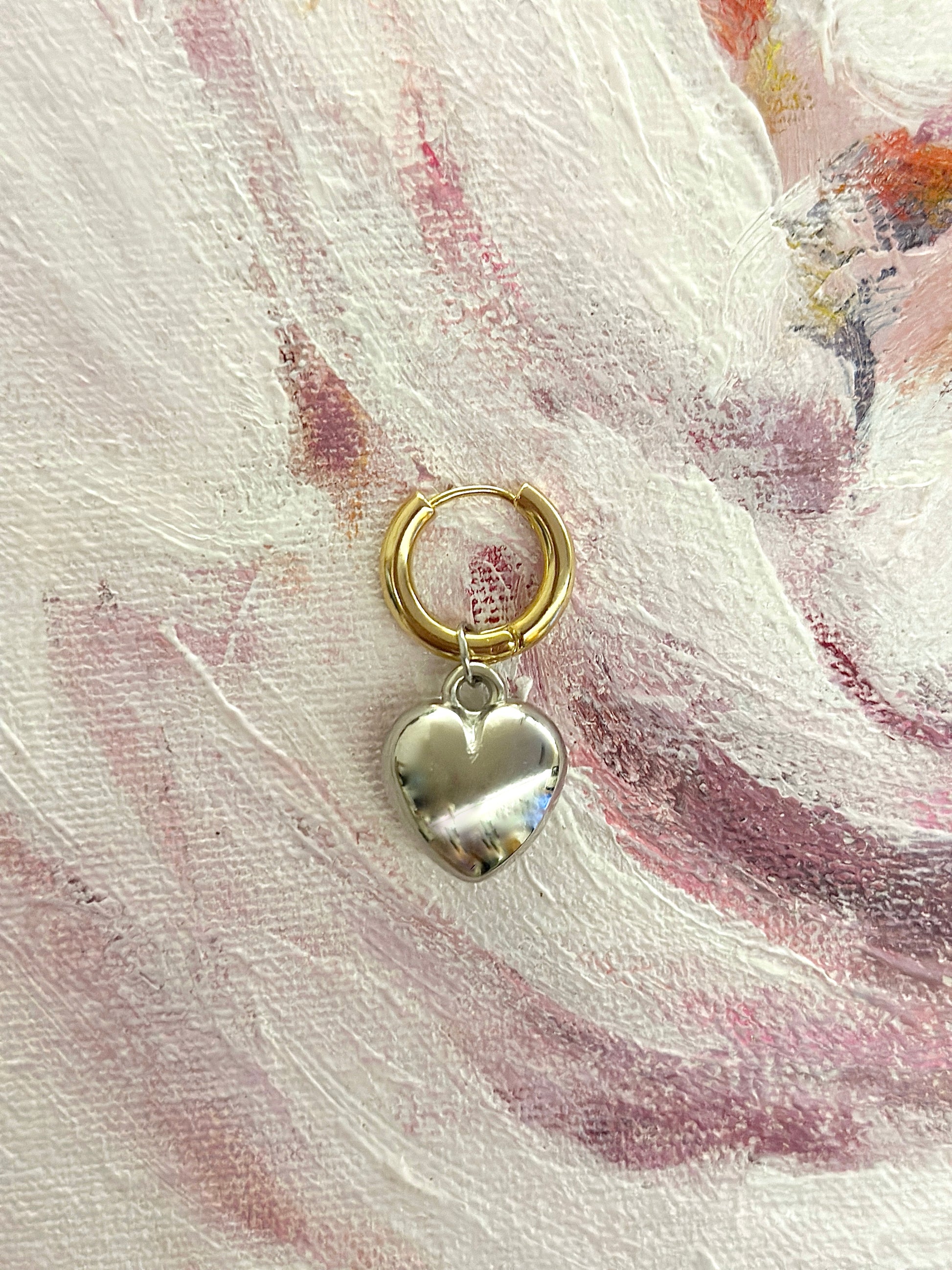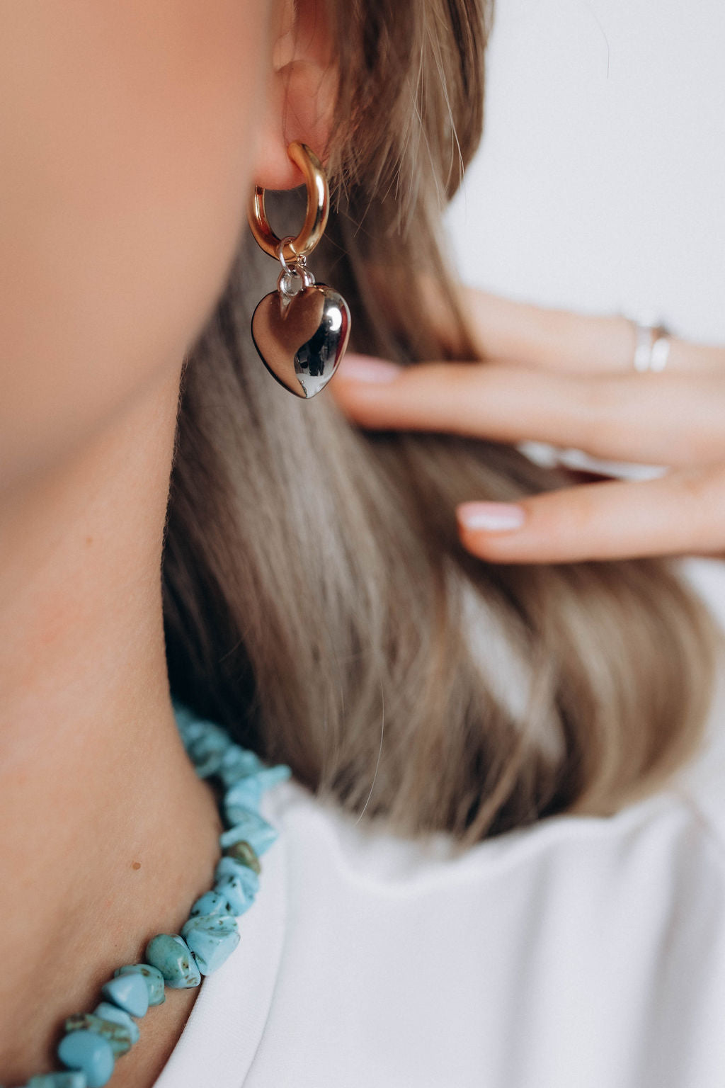 Šie romantiskie sirsniņu formas auskari piešķir maigu un elegantu akcentu tēlam. Sudraba un zelta apvienojums vienā rotā ir šī brīža tendence. Zelta krāsas rinķis un sudraba krāsas sirds kulons.