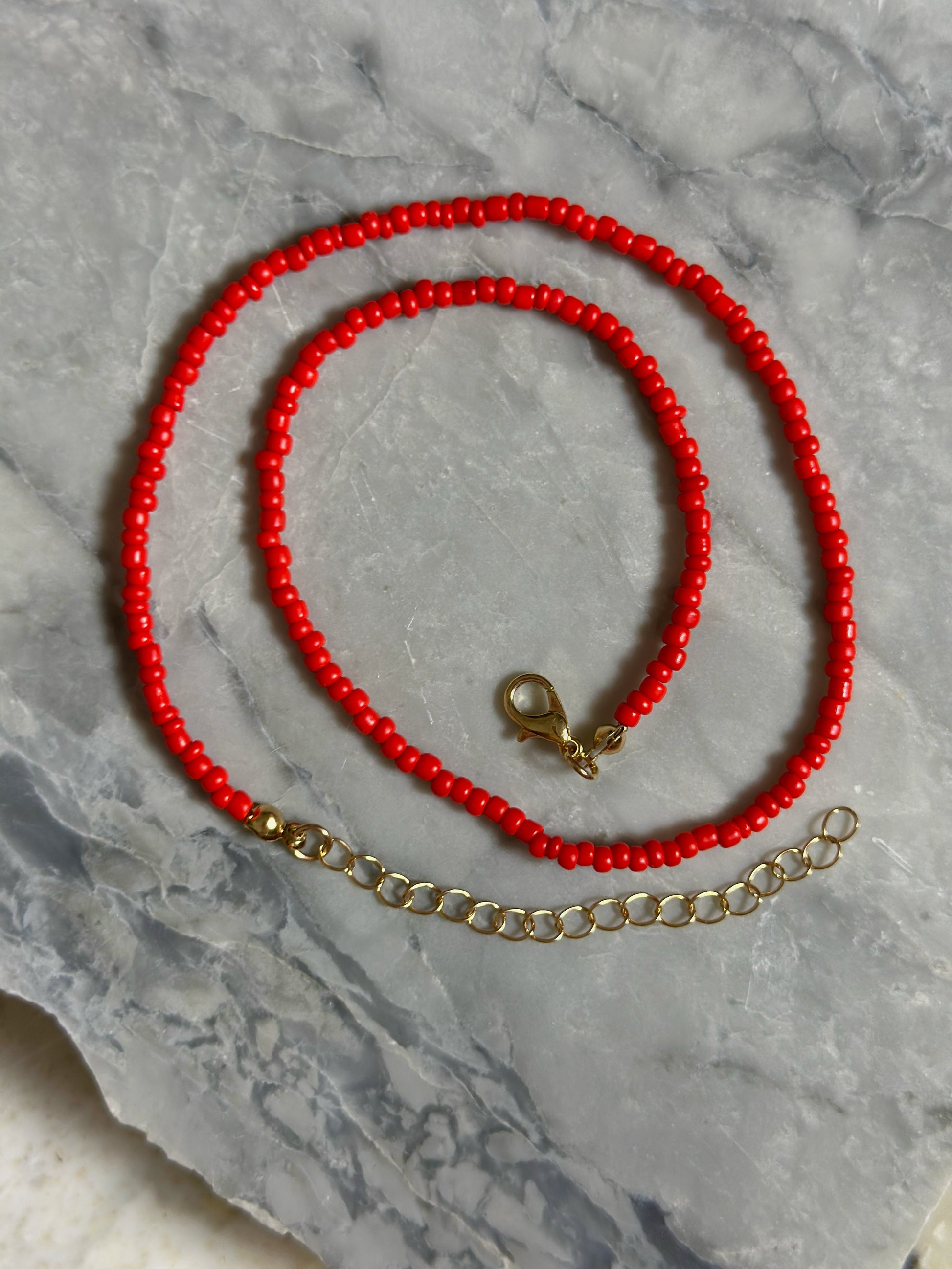 Spilgti sarkanas krāsas čokers no mazām pērlītēm, kas skaisti papildināts stilu. Pievieno savam stilam krāsas! Nesā vienu vai kombinē ar citiem čokeriem.