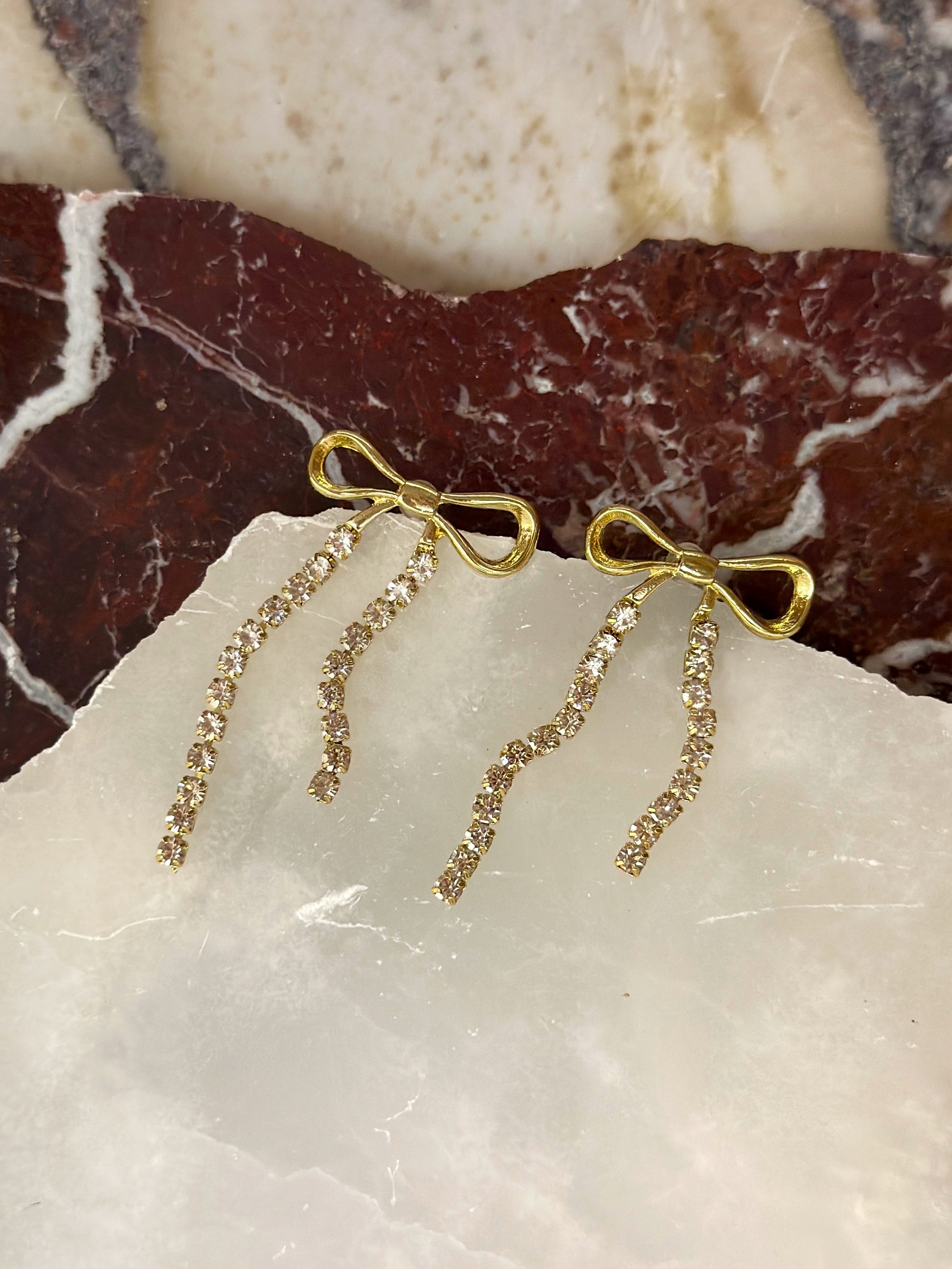 Moderni, zelta krāsas, bantīšu auskari ar elegantu dizainu. Auskari apvieno klasisko zelta toni ar modernu bantīšu formu. Auskaru dimantiņu daļa ir brīvi krītoša. Šie auskari būs lielisks papildinājums aksesuāru kolekcijai.