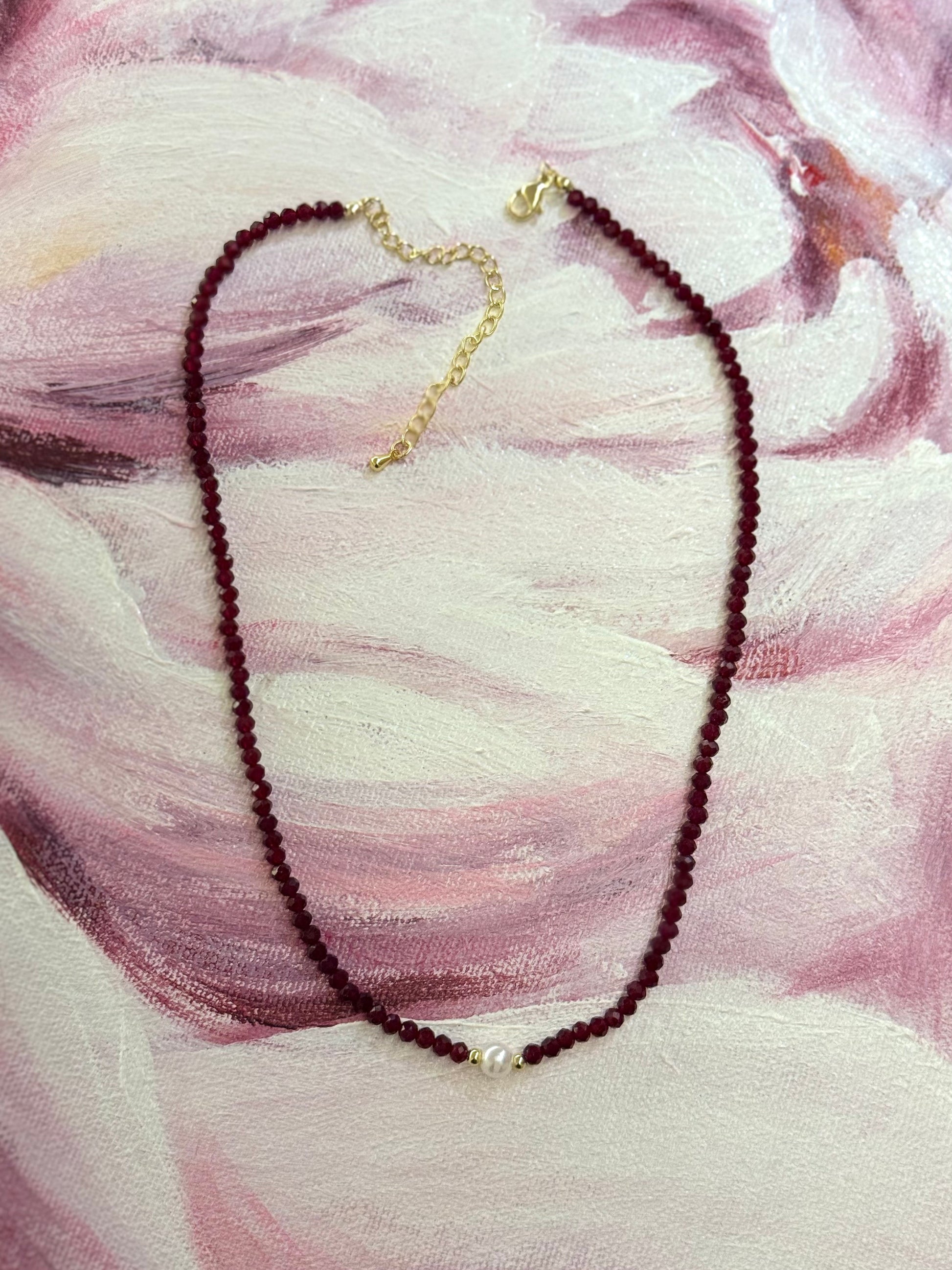 Smalks čokeris bordo krāsā ar baltu pērlīti pa vidi, zelta aizdare. Papildini savu tēlu ar elegantu bordo čokeru vai kombinē to ar citām kaklarotām.