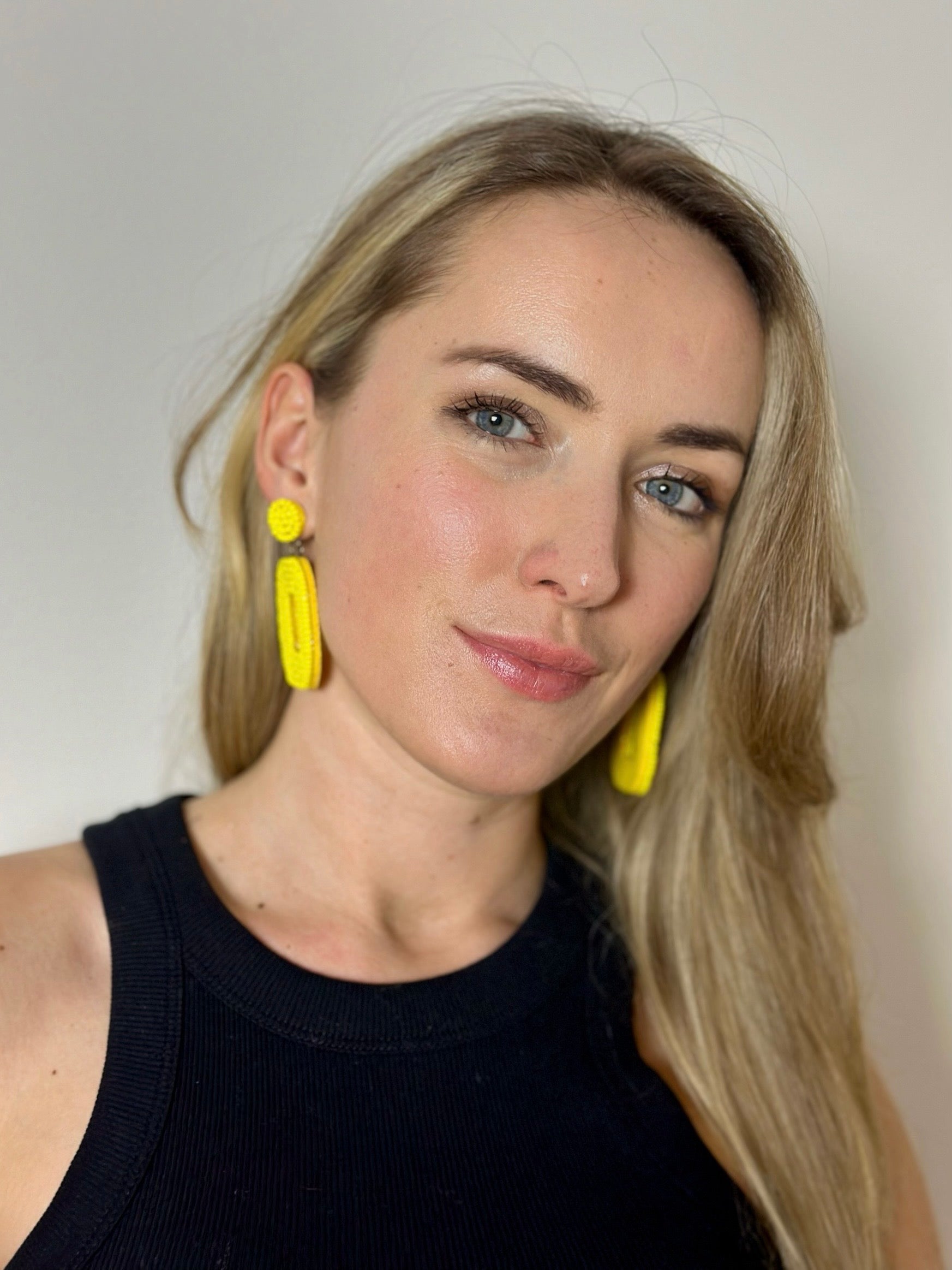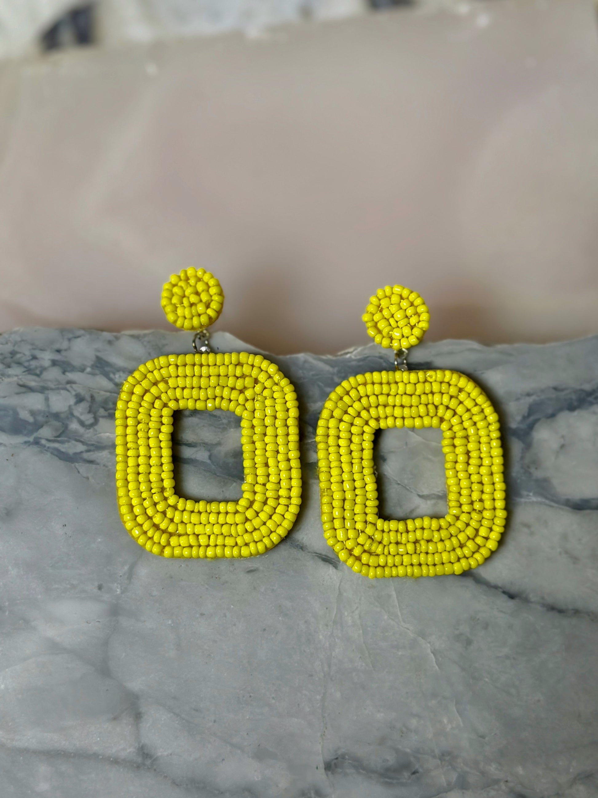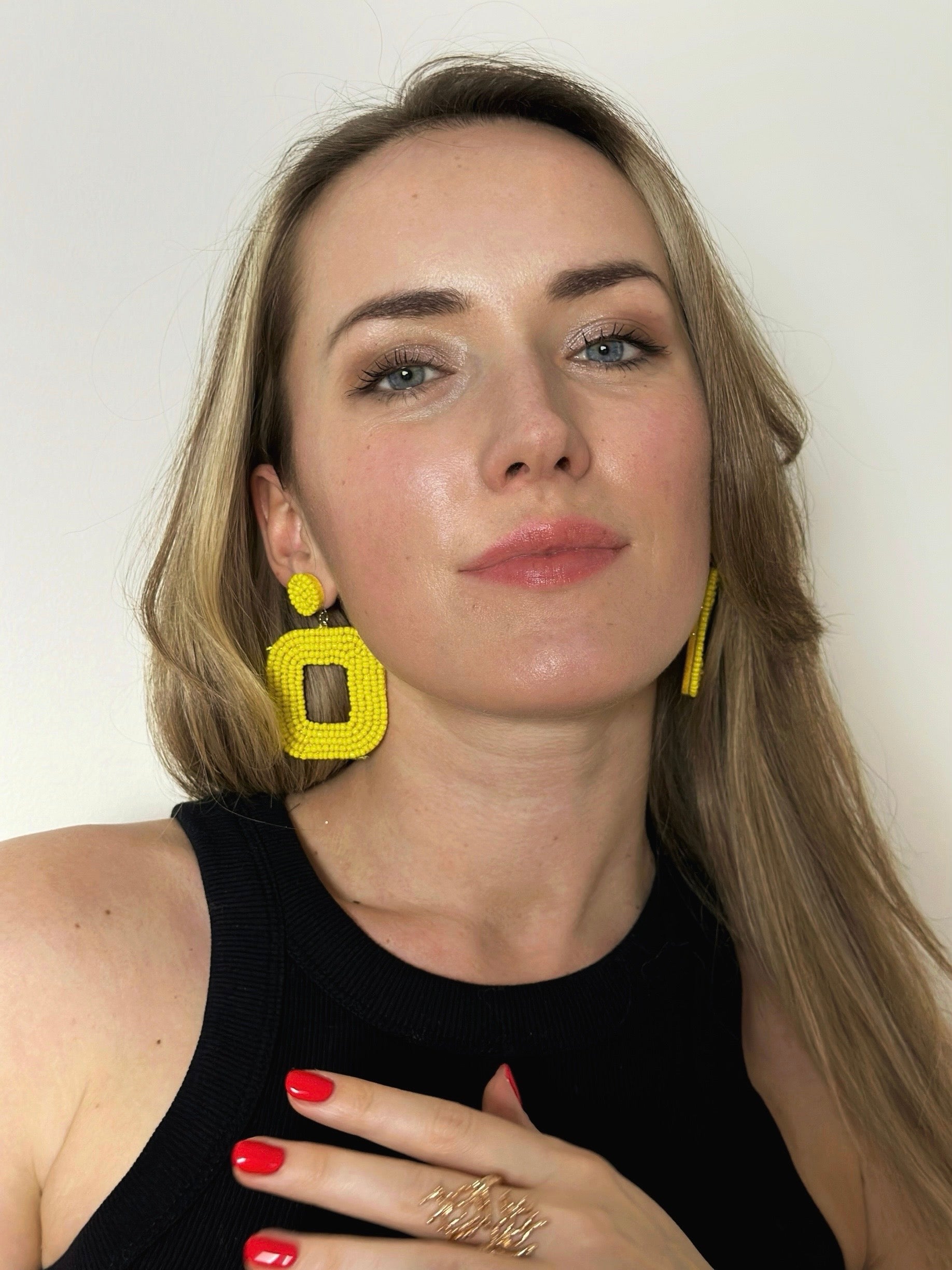 Nokareni, izteiksmīgi dzeltenas krāsas auskari. Tie sastāv no filca pamata uz kura ir izšūtas dzeltenas, smalkas pērlītēm. Pievieno dzīvīgumu savam tēlam!