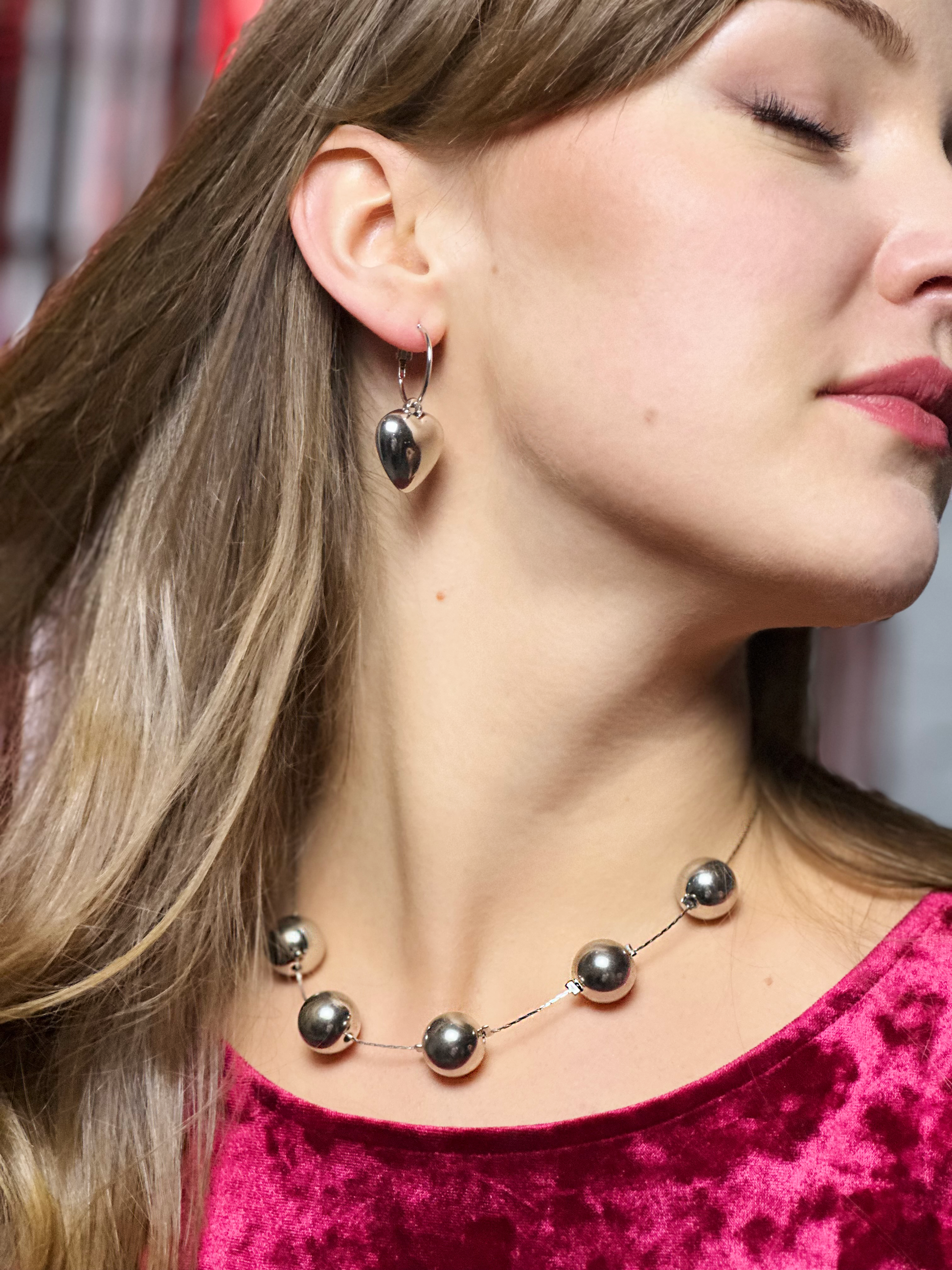 Izsmalcināti un rotaļīgi auskari, kas apvieno klasisko riņķa dizainu ar romantisku sirds formas piekariņu. Elegants sudraba tonis piešķir tiem mirdzumu, kas lieliski papildinās gan ikdienas, gan svētku tēlu.