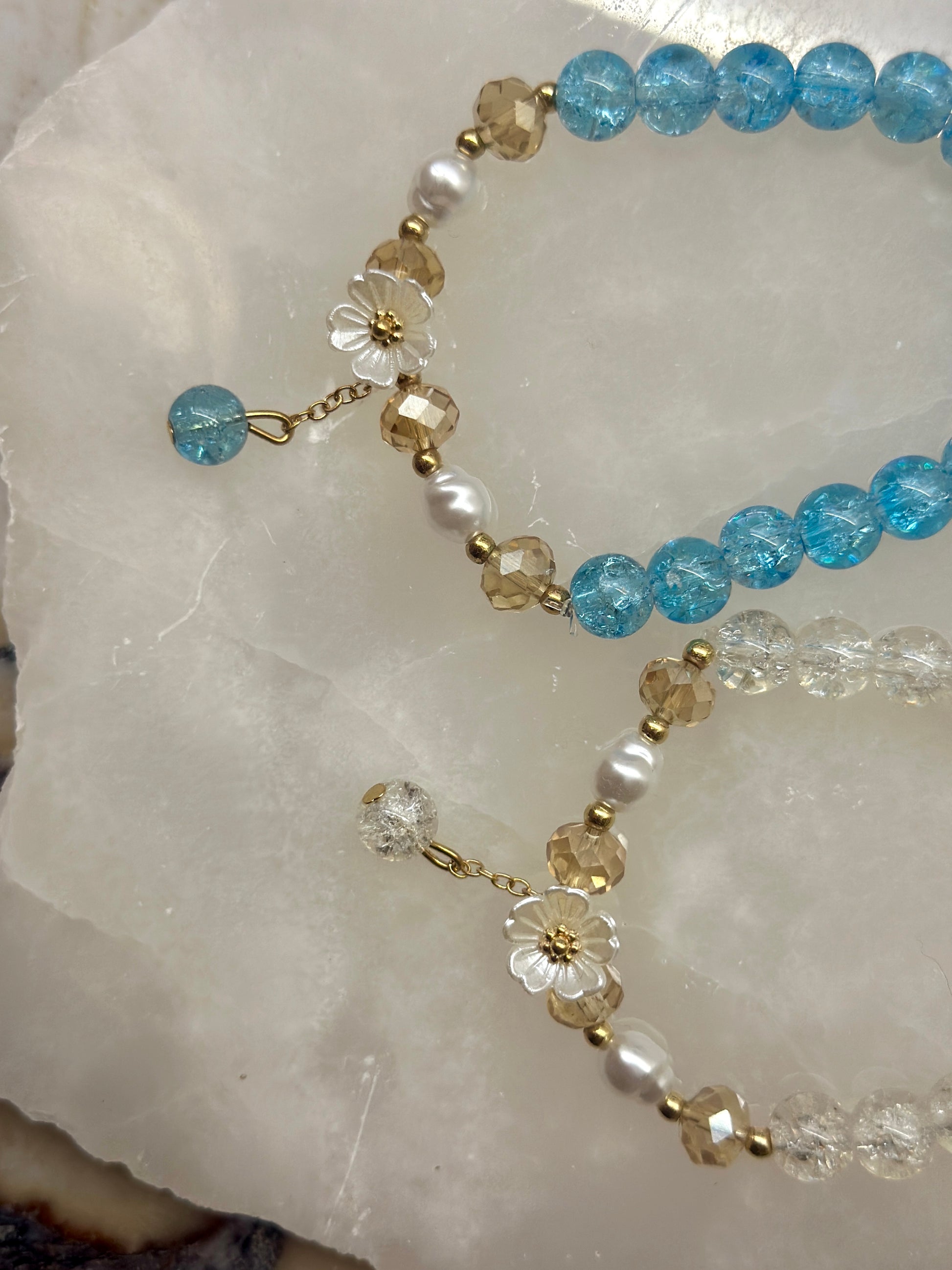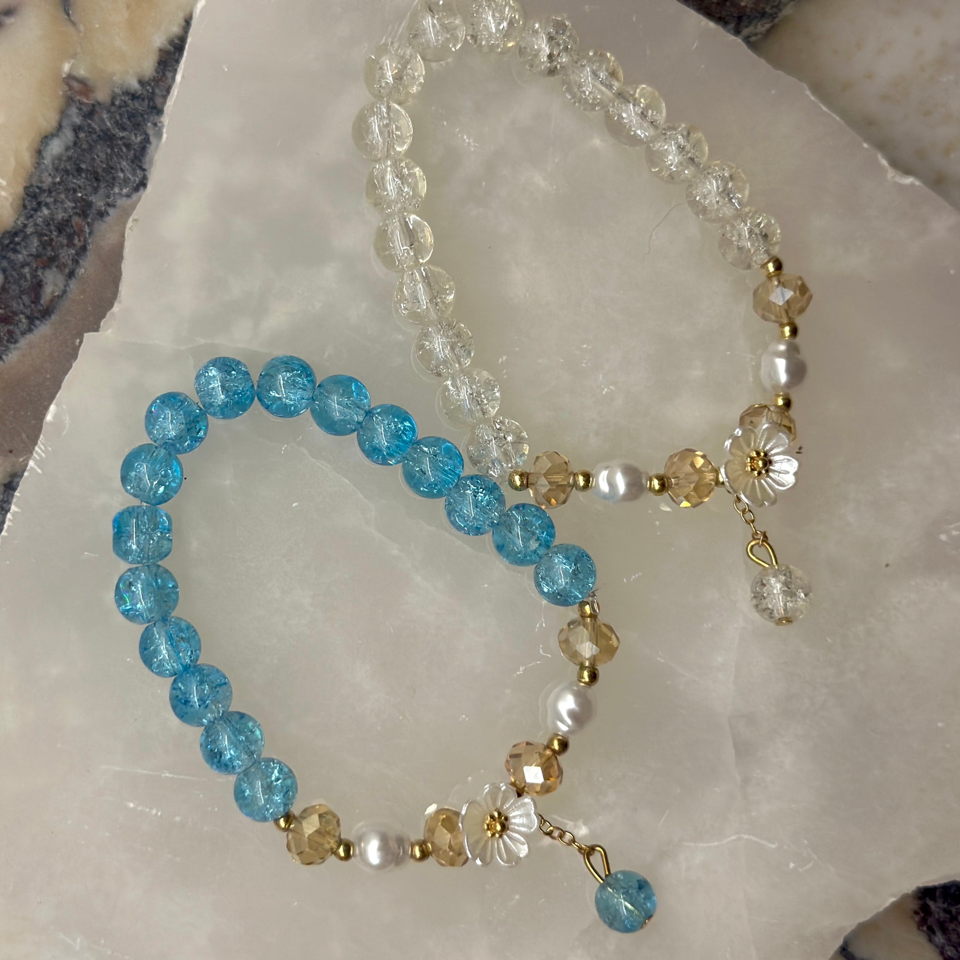 Pērlīšu rokassprādze, kas izceļas ar caurspīdīgu un bēšīgu pērlīšu kombināciju. Papildināta ar pērlītes piekariņu un gaišu zieda akcentu. Šī rokassprādzes piešķirs jūsu stilam vieglumu un eleganci.