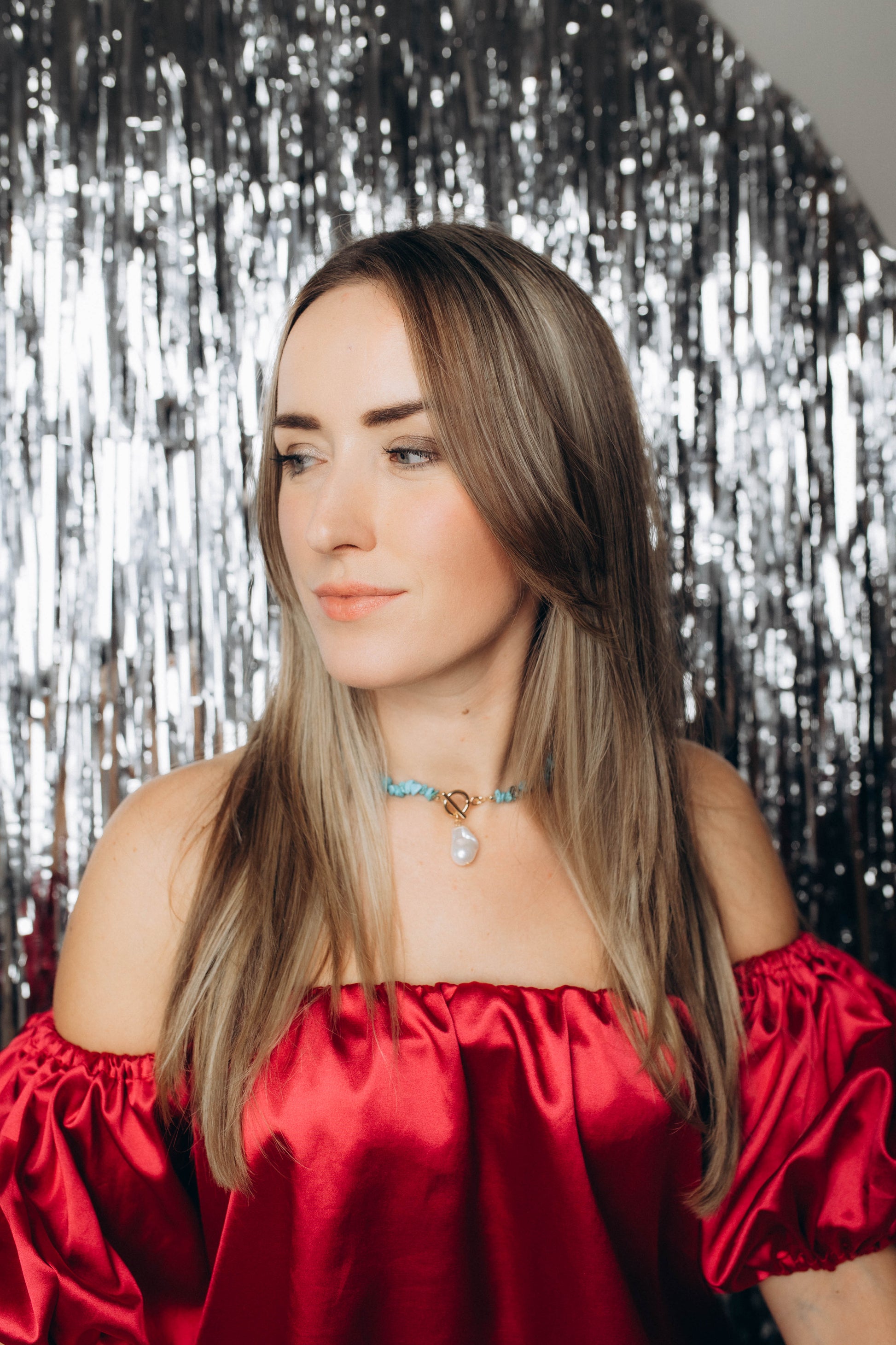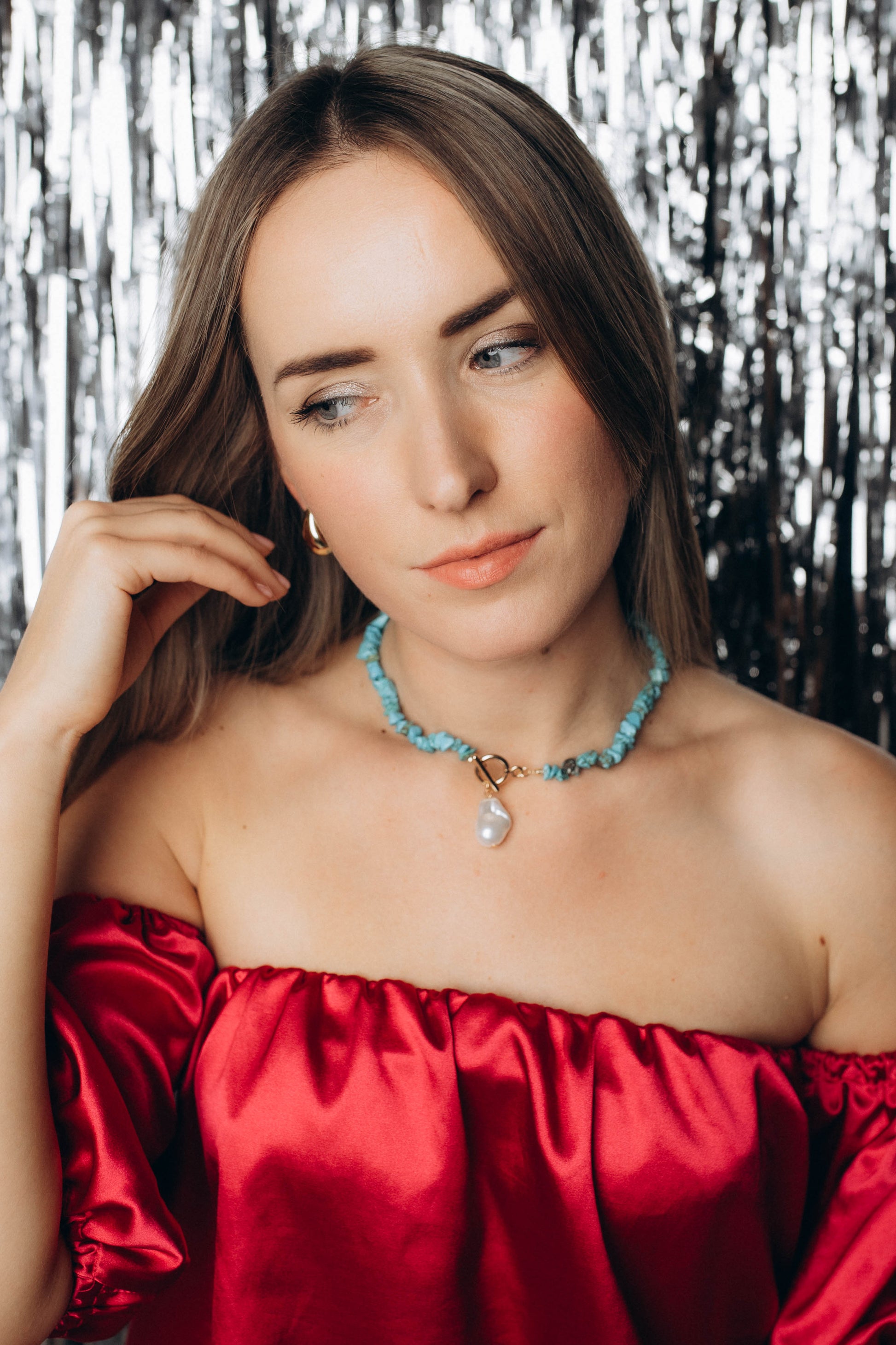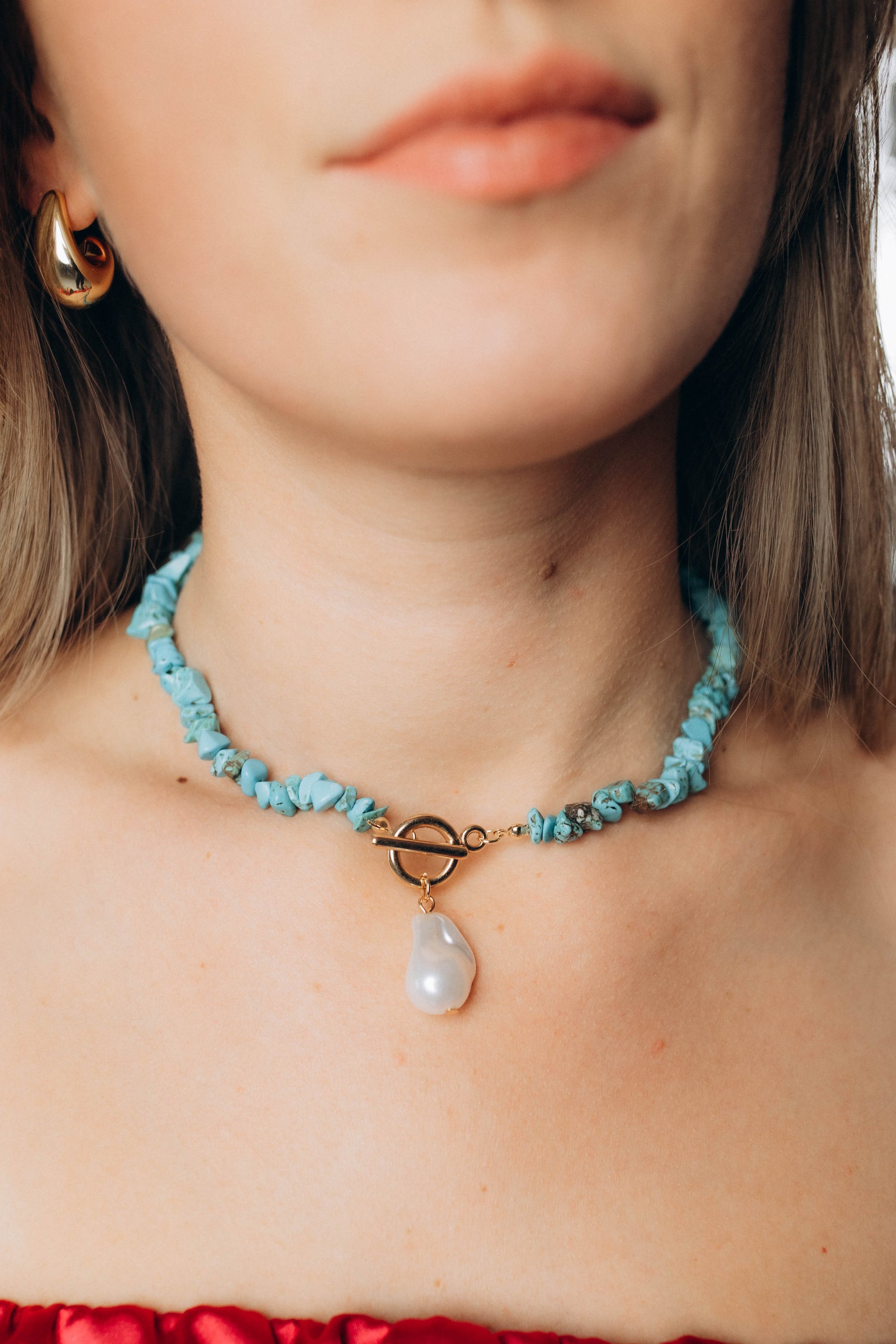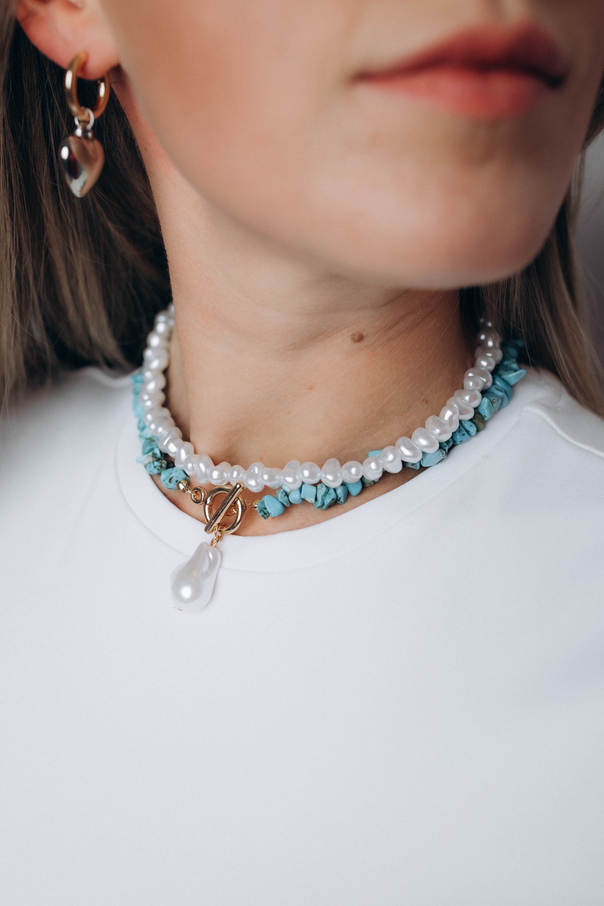 Šis elegants čokeris ir izgatavots no skaistiem tirkīza krāsas akmentiņiem, kas piešķir spilgtumu un unikālu raksturu. Pērļu imitācijas kulons pievieno klasisku šarmu, savukārt zelta aizdare priekšpusē piešķir mūsdienīgu un stilīgu akcentu.